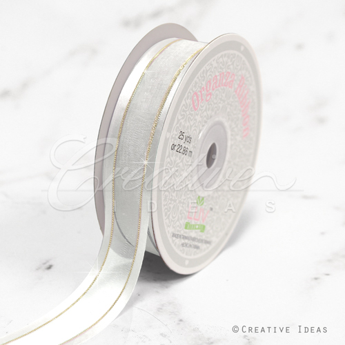 7/8" Organza With Satin And Gold Edge Ribbon - 25 Yards (White)